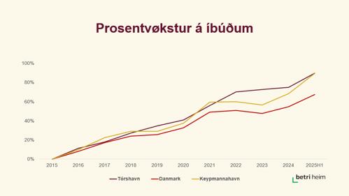 Seinastu 10 árini eru íbúðirnar í Tórshavn dýrkaðar við 90%. Prosentvøksturin er á støði við hann í Keypmannahavn, har íbúðirnar eru dýrkaðar við 89%. Í Danmark sum heild eru íbúðirnar dýrkaðar við 67% síðan 2015.